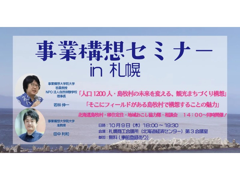 備考 | 人口わずか1200人の北海道島牧村。今年4月に事業構想大学院大学の北海道島牧村サテライト拠点が設置され、村長はじめ、役場職員、事業構想大学院大学の教職員が、将来、観光まちづくりの好事例として紹介されるような「令和の地域活性化」のミラクルを目指しています。島牧村での「観光まちづくり構想」を語ります。札幌市で開催しますので、近くにお住まいの方は気軽にご参加ください。 プログラム 第一部 相談会(予約不要・入退場自由) 14:00~17:00 島牧村・移住定住・地域おこし協力隊相談会(予約不要・入退場自由) 第二部 セミナー 18:00~19:30 事業構想セミナーIN札幌 「人口1200人・島牧村の未来を変える、観光まちづくり構想」 若林伸一(事業構想大学院大学客員教授/NPO法人自然体験学校理事長) 「そこにフィールドがある島牧村で構想することの魅力」 田中利和(事業構想大学院大学准教授) 主催:事業構想大学院大学/島牧村 |