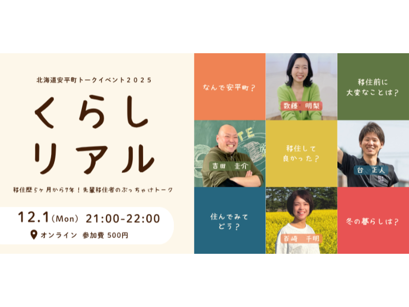 【オンライン】安平町オンライントークイベント2025 くらしリアル ~移住歴5ヶ月から7年!先輩移住者のぶっちゃけトーク~