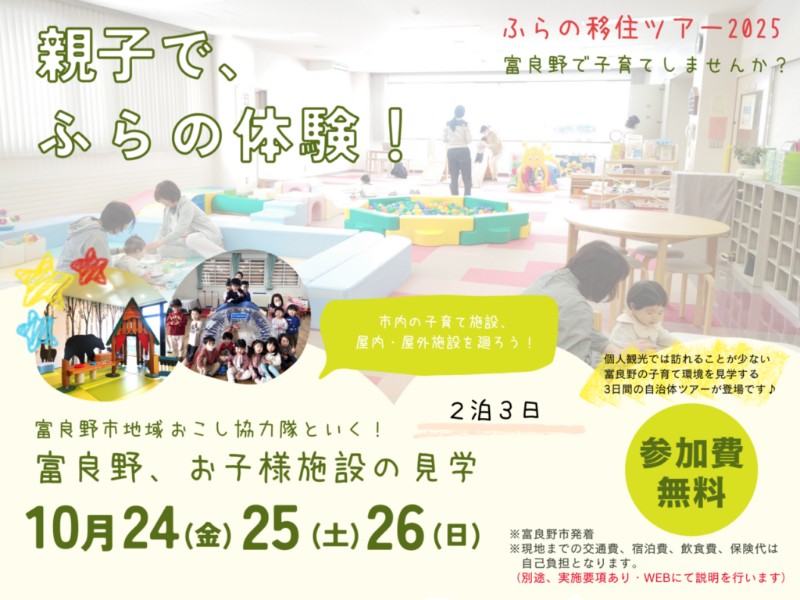 備考 | 富良野市への移住を検討している方を対象に、市内の子育て施設などを見学・体験していただくツアーを開催いたします。移住後の生活をイメージしていただけるよう、観光では訪れることが少ない生活に密着した施設を中心にご案内いたします。お子様と一緒にご参加ください。 日 程 2025年10月24日(金)~26日(日) 2泊3日 【1日目】富良野市集合⇒市の子育て・教育施策等説明⇒チェックイン⇒移住者交流会 【2日目】へそキッズランド・市立保育所等の見学や体験⇒昼食⇒住まいの座談会⇒市内案内⇒富良野自然塾 夜の焚火会(任意参加) 【3日目】市内案内⇒昼食⇒解散 主催:富良野市 |
