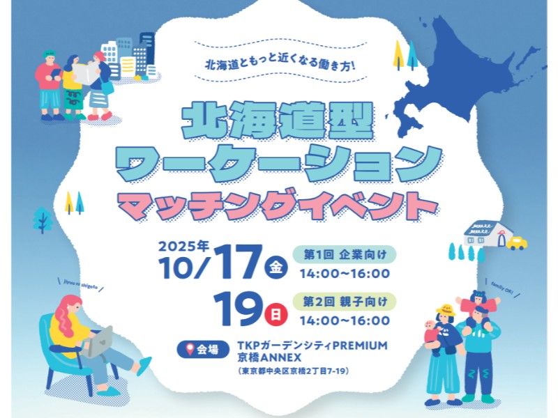 備考 | 首都圏の企業・個人の方に北海道でのワーケーションの魅力を知っていただき、市町村と直接マッチングできるイベントを、10月17日(金)と19日(日)の二日間で開催します! 10月17日(金)は“企業向け”、19日(日)は“親子向け”と、 それぞれ異なるテーマを設定し、各市町からの出展者や北海道内でのワーケーション経験者から、 「北海道だからできるワーケーション」の魅力をご紹介いただきます!! 両日とも、トークイベント後には、各市町と直接話ができる交流プログラムを実施します! 北海道の特産品をつまみながら、気軽に話すことができる時間となります♪ ぜひご参加ください!! ■内容 ・北海道型ワーケーション紹介プレゼンテーション ・自治体紹介 ・体験談のご紹介 ・(10/17のみ)セッション「地域での二地域居住と新しいつながり」 ・交流プログラム「ブース相談会&軽食」 主催:北海道 |